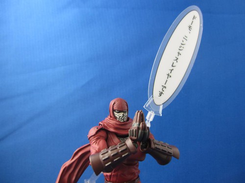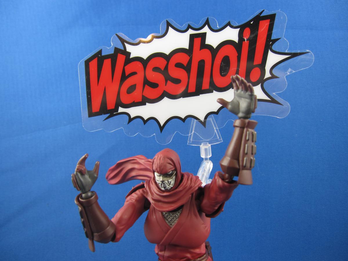 This figure has a lot to say: six different word bubbles made out of soft plastic that you can prop up. There's a whole assembly to plug into Ninja Slayer's back so that the words will appear behind him. “Ninsatsugo” is Ninja Slayer's very specific language, and is as much a character in the original novels as any ninja. In addition to “WASSHOI!!” there's “Aiieee!”, “Guwaa!”, “Iyaa!”, “Recite your death haiku!” and my favorite: “Domo, Ninja Slayer desu.” In the world of Ninja Slayer, formal greetings (aisatsu) are extremely important, and even the grimiest yakuza will stop politely and say “Domo.”