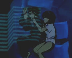 For all of the silliness, the slapstick and the contrived scenes in Video Girl Ai (it IS co-directed by the guy that did Slayers, after all), there are moments that are so tender, so gentle and honest about the feeling of loneliness, that it's nearly impossible not to care for the characters involved. At the end of the first episode, Yota is flashing back repeatedly to that scene in the park, while curled up on his bed. Ai-chan reaches out a hand, touching his arm reassuringly. "Cheer up. Keep up the fight." The pain is almost palpable, and like Yota, we can almost feel it start to drain.