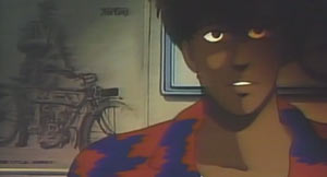 But really, it's animator and future anime super-talent Koji Morimoto who really steals the show. The last three minutes of the film is an absolutely breathtaking point of view sequence from Bobby's motorcycle. Bearing Morimoto's trademark waviness and sun flares, the nearly 100% pen-and-ink sequence is entirely moving-camera, turning corners and watching buildings flutter by in gentle impressionistic strokes. The film is worth seeing for this sequence alone.