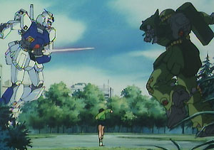 We meet Alfred, a fairly normal 11-year-old kid going to school. He's living on a space colony that's more or less indistinguishable from Earth. There's a war going on somewhere in space between two big forces (the Federation and the Zeons), but the whole matter means little more than entertainment for Al and his friends. Like most boys, they're fascinated by big machinery and stuff that blows up.