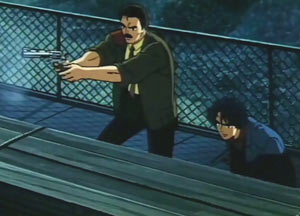To this, Yuki can only note how ridiculous Ryo is. "I've heard that line in some grade-B dramas I've seen," she notes. But Ryo is confident, Yuki thinks he's funny, and soon she's agreeing to dinner. But when Ryo returns to his apartment, a hit-man breaks into his apartment and tries to take him down... WITH KARATE. Like, ridiculous screaming Bruce Lee-style kung fu. This assassin is trying to get back the envelope. Ryo is saved by a Deus Ex Machina by the name of Detective Mochizuki (the hardboiled type with a mustache and a cigarette constantly in hand). Mochizuki has been following the murderer, who is affiliated with a crime syndicate, as is Yuki's professor, who is helping them forge certificates of authenticity for forged works of art. The syndicate has managed to track down Ryo and Yuki as well. The two are taken hostage for knowing too much, and lots of chasing and shooting ensues.