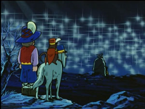 An early collaboration between one of my favorite anime directors Osamu Dezaki and Akio Sugino (who've worked together since on everything from the Blackjack OAVs to the recent Ultraviolet: Code 044), the show has a distinct post-psychedelic look, using the panning clouds and environments to create a surreal, sometimes nightmarish world for Remi to inhabit. Though the technique is most often used to save money today, here it's used to spectacular effect in how it captures the world as it must look to a child, who has no frame of reference for much of what he sees. Everything has an enhanced quality; colors seem more vivid, danger seems more menacing, and the strange seems downright creepy. Combined with Dezaki's feel for theatrical style dramatics (look for his trademark "snapshots" of particularly poignant moments) I was reminded of the progressive theater movement that took Tokyo by storm in the 70s.