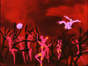 Visually, the film is just incredible. The fact that it was all hand drawn makes it that much more of a marvel. Animated on ones (that is, a cel for every frame, something even Studio Ghibli doesn't usually attempt) and full of lively color and detail, we follow Michael's trek through this bizarre alien world, and watch as his feuding passions, given anthropomorphized shapes, compete for his devotion. Musica does what he can to cause mischief and screw up Florence's plans to live happily with Michael in the flower kingdom, but in the end he gives up easily, and parts from Michael on good terms. There's then a far greater force for them all to contend with.