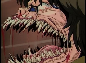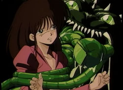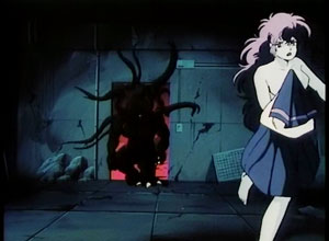 The film is amazingly perceptive for its short running time, using its dark humor to lob sharp criticism at society and gender roles, not to mention the stupidity that horniness brings out in pretty much everyone. Ryou's character is easy to decode: he's normally a nice guy, but when sex is involved he becomes a violent psychopath. The film happily points out that the tentacled monster, long the staple of grotesque comic pornography by this point, is little more than the male libido itself: destructive, scary and stupid. The women, already far from being the innocent, docile playthings of lesser anime, are taken to task for being too blinded by their own libidos to see that they're willingly throwing themselves at an inhuman creature who will inevitably do them great harm. Moreover, the entire erotic grotesque genre (typified by Toshio Maeda's hugely influential Urotsukidoji) is taken to task for being essentially a reflection of this, the worst type of romantic relationship.
