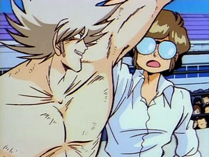 The grudge match plays an awful lot like early scenes of Project A-ko, except cranked up a few knotches and with more masculinity. It's incredibly stupid, but so much fun that stupid just adds bonus points to the proceedings. The characters are literally the only people taking the story -- or the matches -- seriously. The animators are more interested in silliness, like the sparrows that are drawn as little yellow blobs, but wear "sparrow" signs.