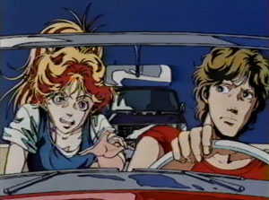 The look of the cars might be super-realistic, but the character designs and the shading are truly the most memorable things about the OAV. Opting for a posterized, outlined look, it feels much more like an American comic book than anime. That said, the only other place I can remember seeing artwork like this are on some vintage arcade game cabinets. In keeping with Japanese stereotypes of America, there are no minorities anywhere. With the exception of one used car dealer (who I THINK is supposed to be Mexican) everyone is blond-haired and blue eyed. Race issues aside, the look of the show is arresting, if a little visually messy. The low resolution of its VHS-only release doesn't help.