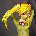 There are lots more little details on this figure to like-- her face has a fantastic smirk sculpted on it, with very bright, thoughtful eyes. It isn't difficult to sculpt a figure with a pair of colorful but blank peepers, so it's great to see some effort put in to a figure so that she appears to have something on her mind, rather than just standing there with a stupid grin on her face. The figure's hair is quite ornate in how it's sculpted, with flowing strands everywhere and just enough definition to make it look as real as you can expect from bright yellow locks growing from a smiling plastic schoolgirl. The paint on the hair is quite amazing as well-- it's not just flat yellow, but one color flows into another all over her head, giving it a much more striking look than you might've otherwise expected.