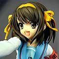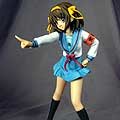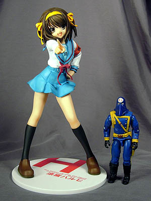Haruhi Suzumiya from the series Melancholy of Haruhi Suzumiya, with a display stand and a few swappable parts, like an armband and a hand. Cobra Commander is not included, he's just there for scale again.
