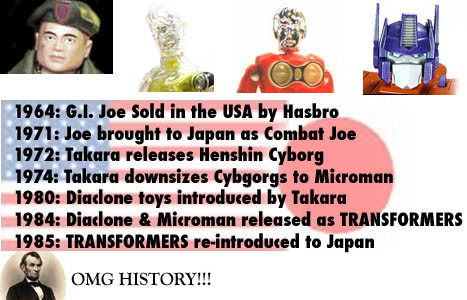 The Microchange toys (and another Takara line, Diaclone) does reasonably well in Japan and is exported to Europe, South America, and elsewhere. Hasbro see it and decides to take a bunch of the toys, recolor them, repaint them, and rebrand them as the Transformers, with these toys receiving faction logos, stories, and an all-new history from various teams inside Hasbro and at their publishing partner, Marvel Comics (who, legend has it, invented the Autobot and Decepticon logos as well as named most of the characters.) A year later, this rebranded pile of robots would be re-imported to Japan with the storyline and branding used in the USA, as kids loved it and the line continued to have great success for years.