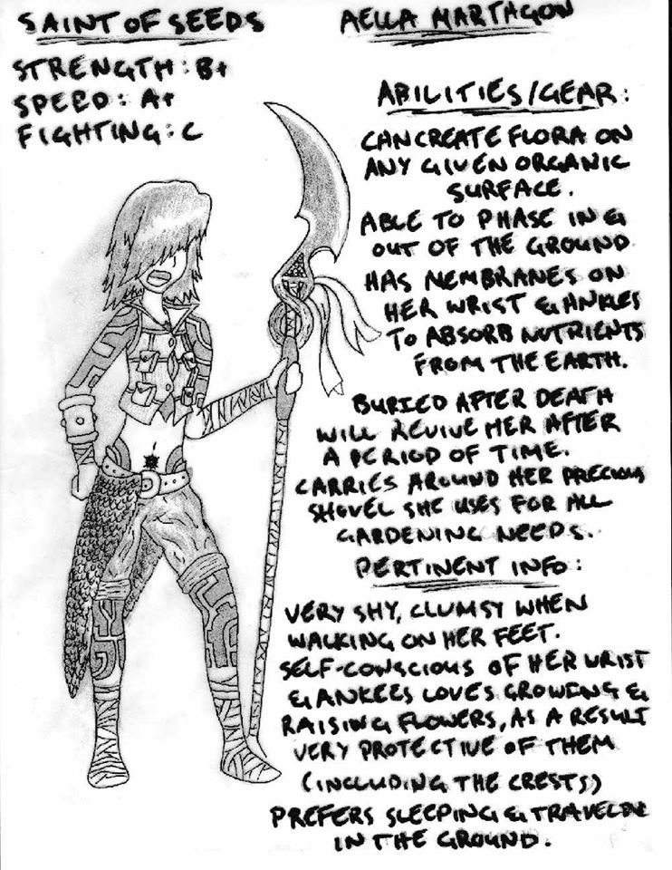 Unique Ability: She is the saint of knives. She can summon them from anywhere at anytime. She is flexible and fast and really strong