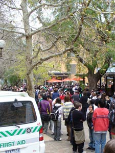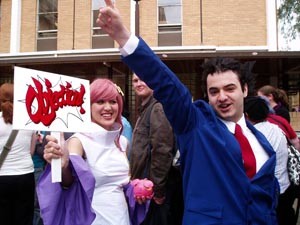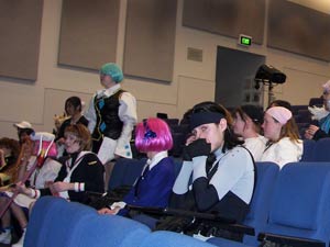 I received some stats before attending the convention, and 2800 pre-registration memberships were sold through the website. Roughly 1400 memberships were available to purchase at the door. Upon arriving at the convention the pre-registration line was easily five times longer than the purchase memberships line. Imagine a line over 200 meters long and five people thick. Did I mention this was well after the convention had “opened” its doors? It turned out that the registration system had a fatal flaw; printed only on paper (no computer), the pre-registration information had been sorted by registration number and not name. This caused massive delays resulting in many people waiting in line for over 2 hours. Now the Manifest Line Ride is nothing unusual, but this year was getting to be beyond a joke. Fortunately, the committee did act responsibly, and they apologized for the heavy delays through the Manifest website.The saving grace was a local band, My 6 Cents Worth, who entertained the crowd with rock renditions of various Anime themes and their own musical compositions. While their singer couldn't quite do the vocal gymnastics that the range of songs demanded, the guitar heavy group helped take the line's mind off waiting in line. And as an added plus, the convention apparently received noise complaints because of the band's performance. Very rock and roll indeed!