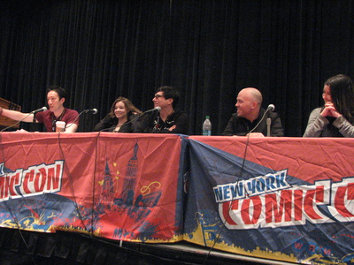 The Fairy Tail panel room was completely packed, and many people who had waited in line to get in were turned away. The panel got started a little late, and while the audience was waiting for the guests to arrive, Funimation's Adam Sheehan reminded the audience that the first 13 episodes of Fairy Tail will go on sale on DVD on November 22.
