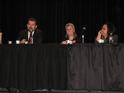 Charles Brownstein, Executive Director of the Comic Book Legal Defense Fund (CBLDF), Erica Friedman from ALC Publishing, and Deb Aoki from About.com's manga blog hosted the panel on defending manga.
