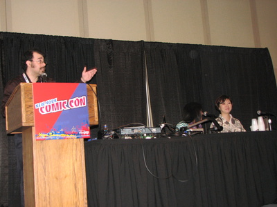 Vertical's Ed Chavez moderated the panel with manga creator Moyoco Anno on Saturday morning. Chavez introduced Anno, who was wearing a cream-colored kimono, and then Anno addressed the audience by thanking the audience for coming to her panel and saying she was delighted to be there.