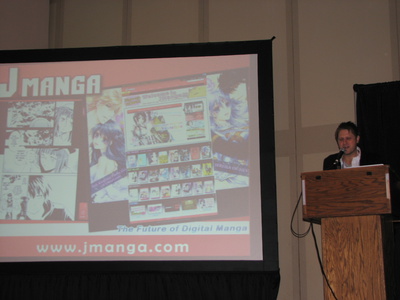Robert Newman hosted the standing-room only panel on Saturday afternoon for JManga. Newman started off the panel by giving away 5,000 points for the website to the audience member who could scream "yomitai" (I want to read) the loudest.