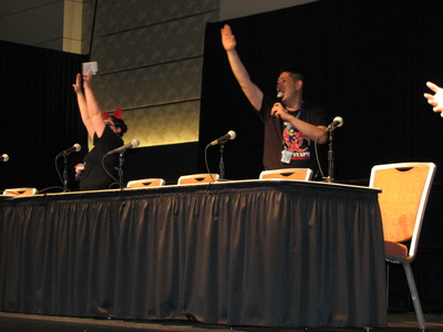 The closing ceremonies got off to a late start to a completely packed and very lively audience. Con chair Terry Chu kicked off the opening ceremonies by thanking the attendees for coming. He then revealed an unconfirmed preliminary attendance number: 34,892. Chu said that as of the first day of the con on Friday, they had broken last year's numbers. Chu then asked Otakon staff members to stand and be recognized.