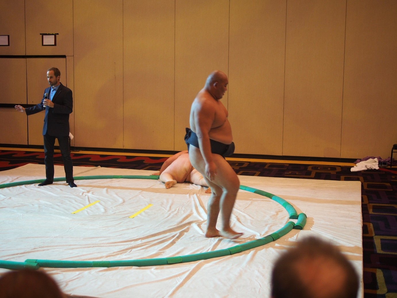 More popularly attended were the two sumo wrestling matches, featuring US sumo wrestler Kelly Gneiting, who holds the Guinness World Record for Heaviest Person to Complete a Marathon (at 400 lbs), and Mongolian wrestler Byambajav Ulambayar, who bested Gneiting nine out of ten rouds. Afterward, attendees were invited to come up to the stage and try their hand against the professionals.