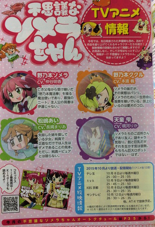 The October issue of Ichijinsha's Manga 4 Koma Palette magazine revealed on Saturday that the Fushigi na Somera-chan TV anime will premiere on the Saitama TV channel on October 8 at from 25:00-25:05 (effectively October 9 from 1:00-1:05 a.m.). The show is also premiering on the following channels: