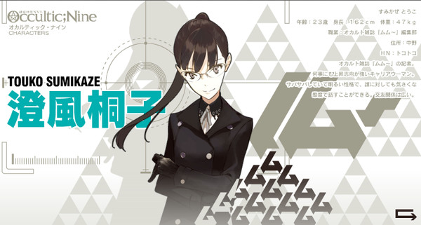 Shizuka Itou as Tōko Sumikaze, a reporter for the occult magazine Mumū (a nod to the real magazine Mū), with a life outside occult interests