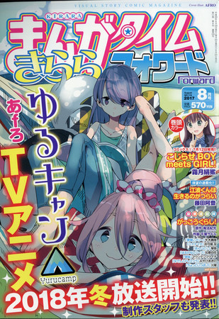 Japanese retailer Rakuten is listing the cover of the August issue of Houbunsha's Manga Time Kirara Forward magazine, which reveals that the television anime of Afro's Yurucamp (Yurukyan△, Laid-Back Camp Δ) manga will premiere in winter 2018. The issue also reveals the anime's staff, and the manga features on the cover. The issue will ship on Saturday.