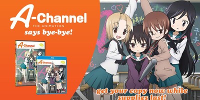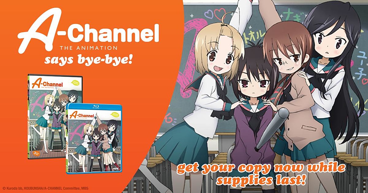 Sentai Filmworks is listing that its home video release of the A-Channel anime series will go out of print as of April 30, or as long as supplies last. The company's site is currently selling the Blu-ray Disc for US$11.99 and the DVD for US$9.99.