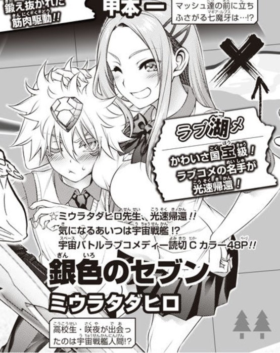 This year's 32nd issue of Shueisha's Weekly Shonen Jump magazine revealed on Monday that the magazine's combined 33rd/34th issue on July 20 will include a one-shot by Yuuna and the Haunted Hot Springs' author Tadahiro Miura. The one-shot is titled "Giniro no Seven" (Silver-Colored Seven). The "space battle romantic comedy" manga centers on high school student Sakuya, who meets the "Space Battleship Human."