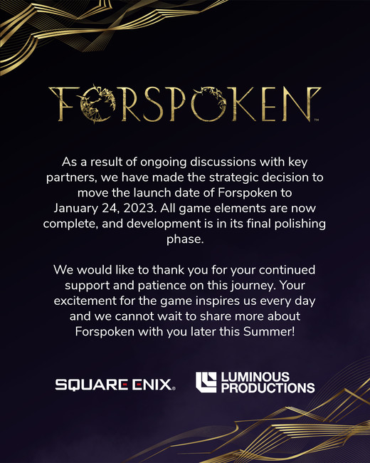 Square Enix announced on Wednesday that it is delaying it and Luminous Productions' Forspoken game again from October 11, 2022 to January 24, 2023 "as a result of ongoing discussions with key partners." The company states that all game elements are complete, and development is in its final polishing phase.