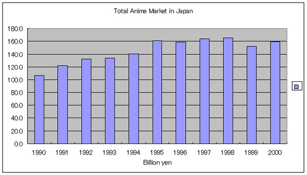 Total sales of Anime market are between 150 and 160 billion yen (See graph A). Sales are not reflecting the rapid growth, despite the fact that Anime has been more eagerly expected. Moreover, Japan suffers from economic depression these years. It seems that a lot of firms have come to see Anime as a rare sound investment. Reports of the growing popularity of Anime in overseas markets must have influenced them.