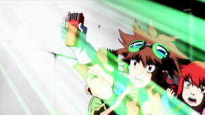 Our newest goggle-head Taiki, (yes the goggles are back,) finds himself called into the Digital World with two friends when the barrier between the digital plane and the biological one begins to break down, resulting in a rent-open sky, cars being wedged through buildings at the fifth floor, other common apocalyptic signs in Japanese cities. Apparently the Digital World is in a state of all-out war, different from past seasons where an evil overlord already reins supreme. (Except in Tamers which, let's face it, was just plain different.) Taiki's new partner, Shoutmon, will combat the evil forces using Taiki's power to combine with his other friends, bunco blox-style, and become stronger. What happened to digivolving? Not sure, as this season is taking a decidedly more Gurren Lagann-meets-sentai approach to shake things up, but the kids and digimon are already bursting with personality, so it's a nice healthy start to a season both familiar and clearly trying to be different.