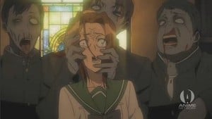 The first episode wastes no time in getting down to business. High school student Takashi is drearily contemplating the loss of his childhood friend Rei to a classmate when the havoc breaks out: a zombiefied man stumbles to the school gate and bites a PE teacher who tries to push him away. Said PE teacher gets infected, dies, and sooner than anyone can figure out what's going on he starts chomping on his former colleagues, which initiates a chain reaction of death and zombiefication which quickly spreads across the school. Takashi has the jump on the incident because he saw it happen, but even so he, Rei and Rei's current boyfriend must battle though zombie students to get to relatively safety, only to learn that their school is far from an isolated incident. A bleak future awaits Takashi and Rei (the boyfriend, predictably, doesn't make it), although they are not the only survivors.