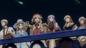 Or, to be more precise, this is the anime adaptation of a 2009 “adult visual novel” release for PC and PSP platforms. This first episode is almost entirely an exercise in cast-gathering and introductions, so little actually happens that could constitute a plot. Events take place in Ert'Aria, a trade-focused city located on the northern fringe of the country of Nostrum which is also known as a prime viewing spot for an every-seven-years meteor shower. Amongst the most prominent groups in the city is Clan Oasis, whose mistres, Carina Verritti, seems to be one of the primary female leads. The male lead, Leceister, is either a worker for, or a member of, Clan Oasis and dear to Carina's heart. Leceister's sexy, young-looking mother and a maid also figure into the picture, as does a puppeteer Carina and Leceister encounter, a female Holy Knight who is a friend of Leceister's mother, and neighboring twin sisters named Risto and Salsa Tortilla (no, really). During the meteor shower a special girl who's been sleeping but awakens to fulfill some special purpose also makes a grand entrance.
