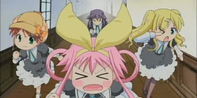 Meanwhile, those who survive long enough to watch the actual episode can look forward to brain damage as a complement to their burned-out eyes. The plot centers around a color-coded quartet of schoolgirls known collectively as Milky Holmes, who use their psychic powers (known as "Toys" in this universe, because apparently creators are running out of goofy nicknames for psychic powers) to solve crimes and stop a band of "Gentlemen Thieves." However, when they lose their Toy powers several minutes into the episode, the girls also lose their motivation and start screwing around at the Holmes Detective Academy, where entire generations of schoolchildren can study to be super-sleuths. By the way, if the idea of majoring in Forensic Science before you're even in high school doesn't sound loony enough, consider that the villainous Thieves are all covertly posing as staff and students at the school. If Milky Holmes are so smart, why haven't they figured that out? By the episode's end, the girls are given an ultimatum: get your Toys back in three months or be expelled. This comes as no surprise.