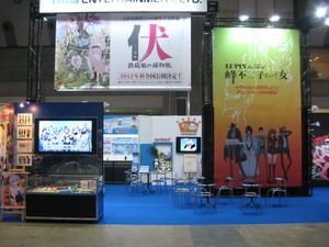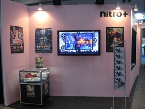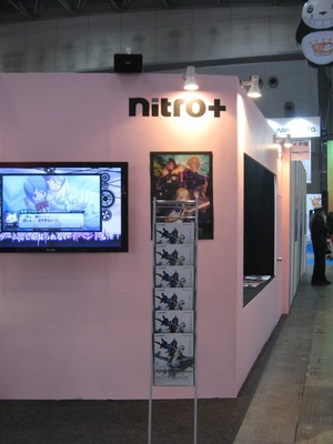 Despite nitro+ writer Gen Urobuchi's protest-cum-acceptance letter he wrote upon finding out that he bagged himself this year's Tokyo Anime Award for best screenplay, the company had a modest display at the event, with a handful of posters as well as a television showing off various titles they have been involved with, including Guilty Crown, Puella Magi Madoka Magica, and Fate/Zero. Particularly noticeable titles included their upcoming Guilty Crown Windows game, Guilty Crown Lost Christmas, as well as their recently-released Madoka Magica Portable PSP game. On public days, a small booth where attendees could buy event-exclusive items including mugs, stickers, and keychains was also opened.