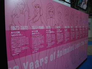 TMS was showing off a number of projects they are involved in, with spaces for the Cardfight!! Vanguard anime, the upcoming Fuse Gansaku: Satomi Hakkenden film, Panda! Go Panda!, and their new Seiyuu Plus smartphone app (http://www.animenewsnetwork.com/interest/2012-03-09/smartphone-app-recreates-calls-with-voice-actors/actresses), the focus of their display for the year was on the hotly-awaited Lupin TV series, Lupin III - The Woman Called Fujiko Mine. Two gigantic advertisements for the series towered over visitors to the booth, and inside was a timeline of the many iterations of Fujiko throughout history, as well as a small area that gave information about the show, complete with a TV looping a trailer for the series.