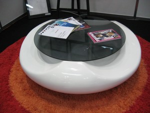 ufotable, the animation studio behind titles including Fate/Zero and the Garden of Sinners movie series, had one of the most homey booths at TAF 2012, with a small exhibit of production art from their Sakura no Ondo anime, which is airing in their Tokushima, Japan ufotable Cinema theater. Visitors to the carpeted booth had to take off their shoes and change into a provided pair of slippers before they could enter, but once inside, they could not only view the anime's line art, but could also sit on a shag carpet by a UFO-shaped table, apparently the original namesake of the company. A small bit of merchandise that is normally exclusive to the ufotable Cinema was also available for sale on public days, including Fate/Zero calendars, blankets, and flash cards.