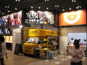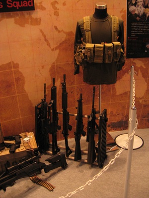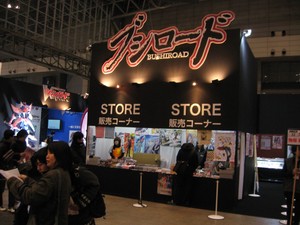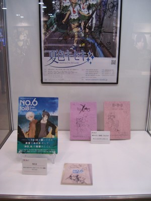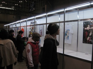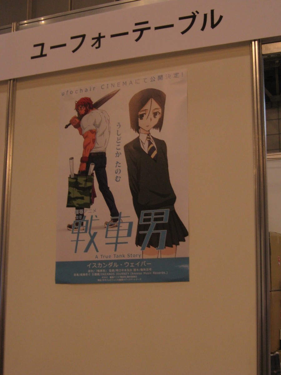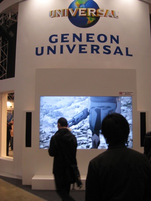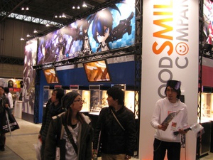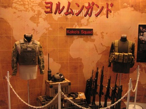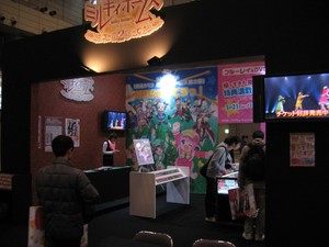 Geneon Universal's round booth featured a large display at its front that played promotional videos for various titles such as Waiting for Summer and Hakuōki, while a small stage area where they held live events promoting their titles could be found inside. Also inside was an area full of military props promoting the upcoming Jormungand anime series.