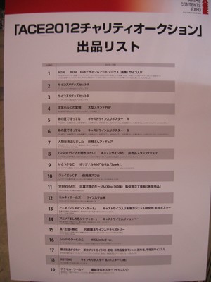 Like Tokyo International Anime Fair (TAF), ACE held a charity auction featuring unique and signed goods, with all of the proceeds going to the Japanese Red Cross Society. Though the selection of items for auction was not as large as TAF's Association of Japanese Animation-run event, the ACE auction nevertheless had its fair share of interesting items, such as signed Listen to Me, Girls. I Am Your Father! staff-only shirts, retailer-exclusive Steins;Gate displays, and even a pre-worn afro wig used by Nitroplus's crazed PR man Joy Max.
