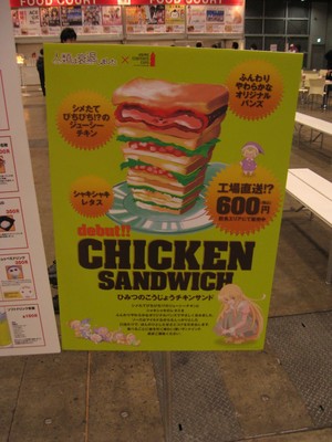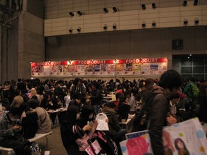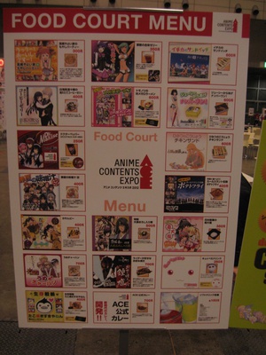 In a show of just how fan-oriented ACE could make their entire event, even the menu of the food court was full of official anime-related food and drink items. Smaller items such as 250 yen (about US$3) bottles of Doctor Pepper that came with a Steins;Gate "Dk. Makise" coaster or 300 yen (about US$3.50) servings of Idolm@ster bean sprouts, as well as larger entrees like 700 yen (about US$8.50) Fate/Zero okonomiyaki and 600 yen (about US$7.25) Waiting in the Summer sandwiches were available, though the line just to get food reportedly required a wait of as much as 90 minutes at peak times.