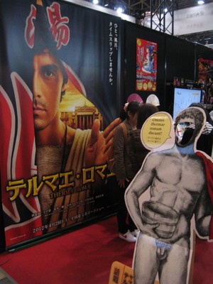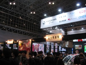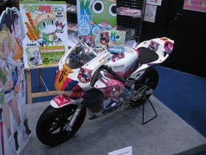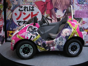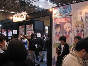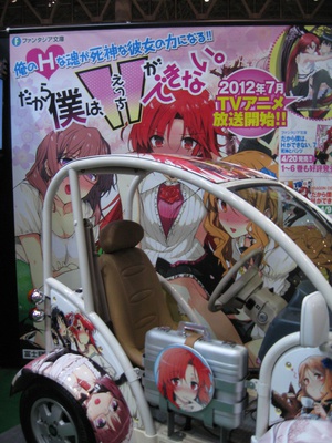 Kadokawa Group's booth featuring a host of its subsidiaries and brands including ASCII Media Works, Enterbrain, Kadokawa Shoten, and Fujimi Shobo took up a large part of the floor right in front of the entrance to the hall. As a result, the booth was promoting a huge number of series, such as Is This a Zombie?, The Melancholy of Haruhi Suzumiya, Thermae Romae, and more. The impressive display of promotional materials included anime-branded cars and motorcycles, paper Thermae Romae cutouts to take commemorative photos with, storyboards from A Letter to Momo, and more. The booth also featured a stage where smaller Kadokawa-related events were held, as well as an area for fans to buy items including signed light novels and manga.