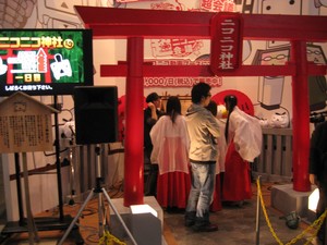 Nico Nico Douga's ACE booth was also similar in appearance to their TAF showing, with heavy promotion of their upcoming Nico Nico Choukaigi (Super Convention), as well as the traveling Nico Nico Shrine where visitors could send their prayers out to the internet and see viewers' responses in real time. However, the website's booth had a small stage inside where they held live-streamed talk and radio shows all day long, featuring various guests from anime series such as The Idolm@ster, Tantei Opera Milky Holmes, AKB0048, and so on, gathering a large throng of onlookers throughout the entire event.