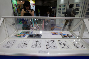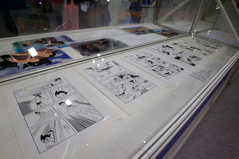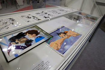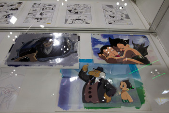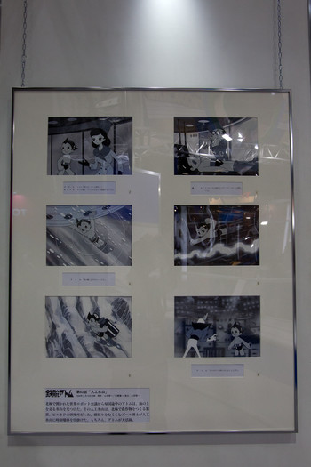 This year Tezuka Productions celebrates the Astro Boy TV anime's 50th Anniversary with a small but priceless exhibit of Tezuka's original manga drawings and color illustrations, anime cels and character sketches, all guarded by a giant inflatable Atom flying high in the sky–well, actually hanging from the ceiling. Opening sequences from the 1963, 1980 and 2003 series are shown on TV screens, but aside from a poster stating that the animated movie Tezuka Osamu's Buddha 2 is in the works, no new anime in sight.