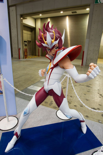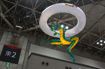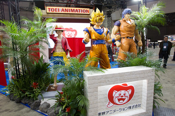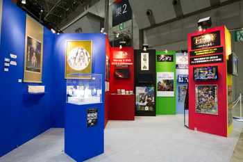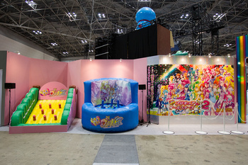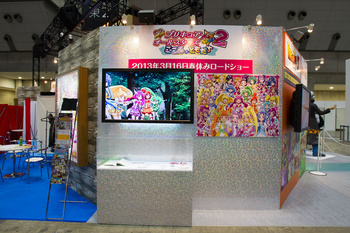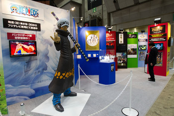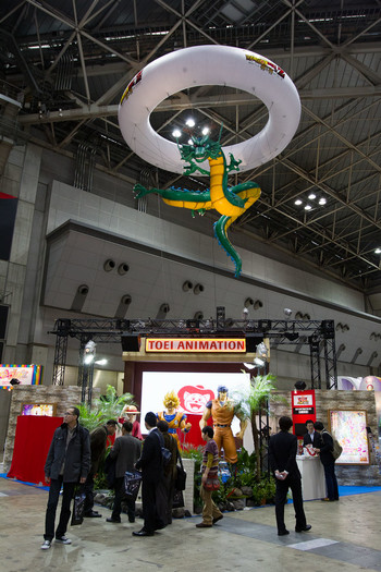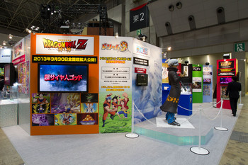Shōnen Jump's great heroes are staging a big comeback escorted by an impressive flying dragon to promote Dragon Ball Z's upcoming animated feature Battle of the Gods. Aside from Luffy, Goku and Toriko's life-size figures, on the right hand side of the booth we find One Piece's Trafalgar Law and Saint Seiya Omega's Kōga as well. Toei is also promoting Pretty Cure All Stars 2: Kokoro no Tomodachi, the movie that just hit theaters, Seiji Mizushima's upcoming movie Rakuen Tsuihō (Expelled from Paradise) and Buddha 2 with posters plus Tanken Driland, Ashura, Kyousogiga and Saint Seiya Omega with posters and videos. But that's not all! In the back we'll find Pretty Cure All Stars' amusement park (well, ring toss game corner) where you can test your ability at throwing rope rings.