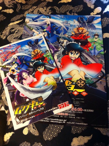 Ishihara's departure from office has probably had some effect on the publishers' boycott (though the current elected Governor is actually his right-hand man) because the manga adaptation anime scene looks much more robust than last year. Sho-Pro, short for Shogakukan-Shueisha Productions Co. Ltd, is promoting the Pokémon franchise with big cut-outs of the current TV series Best Wishes and Pokémon the Movie: ExtremeSpeed Genesect : Mewtwo's Awakening that will be in theaters on July 13th in Japan. Also present were posters for a Zoids Blu-ray box that goes on sale on August 2nd, and a TV anime series based on the manga Chibi-Debi (from Hiromu Shinozuka's shōjo manga), Duel Masters Victory (Shigenobu Matsumoto), Danchi Tomoo (Tobira Oda) and Mushibugyō (Hiro Fukuda) all scheduled to go on air in April. They are also giving away a very nice Mushibugyō booklet with color illustrations and a manga excerpt.