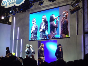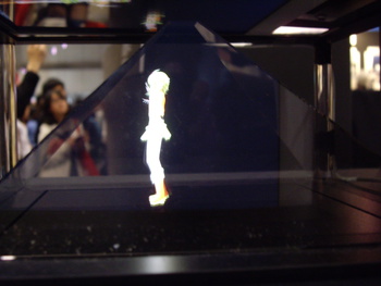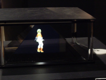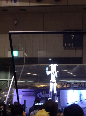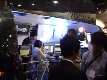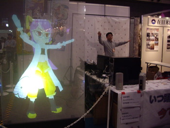 Vocaloid technology was prominently on display. One stand was demonstrating the motion-captured nature of the characters, while elsewhere animated Vocaloids were thrown up on a transparent “SORIS” screen, or performed in miniature in a prism. In the meantime, Miku's fans were engaged in writing her next song album…