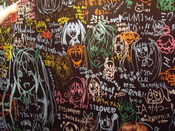 … as well as gracing the covers of a new book extolling User Generated Content, and a wall bearing such fan messages as “Miku is God.”