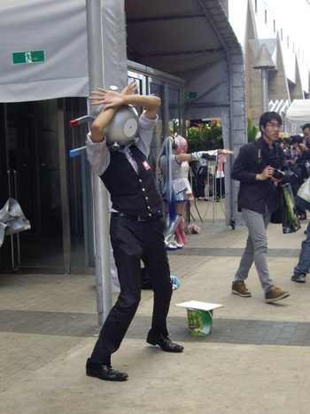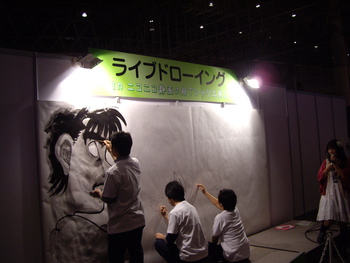 Despite Miku's domination of proceedings, some other anime got a look in, including a heavily overwritten Evangelion. Customers also had the chance to recreate that shock moment from Puella Magi Madoka Magica. Over at the Aniplex stage, a massively silly knock-the-other-person's-hat-off contest was allegedly meant to be a restaging of Sword Art Online, but we're not convinced. Meanwhile, cartoonists were busy drawing their own manga art.