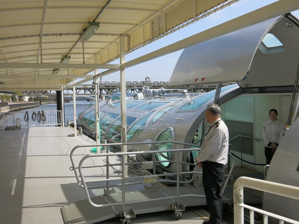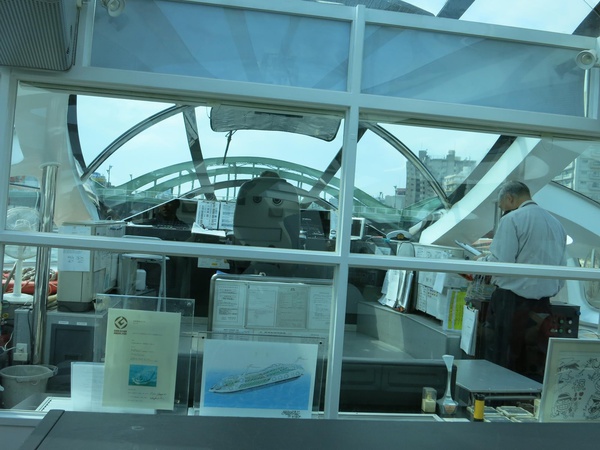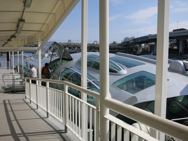 I feel like I've seen this boat a zillion times in every nerd tourism article about Japan since 2000 or so when it first hit the river, and as it turns out, it was our transportation back to my favorite place in the world, the Orange County of Japan, Odaiba. Honestly, it's a little underwhelming. The exterior looks like a particularly cool Disneyland ride vehicle, but inside it's pretty spare. There's a little café with gelato and draft beer, some benches to sit on, and that's about it. It's pretty beat up, inside too; scuffed and nicked everywhere by a million tourists. The real attraction is the ride down to Odaiba, which is relaxing and lets you watch the change from old Tokyo to the reclaimed land with a bunch of goddamn Red Lobsters and Forever 21s on it.