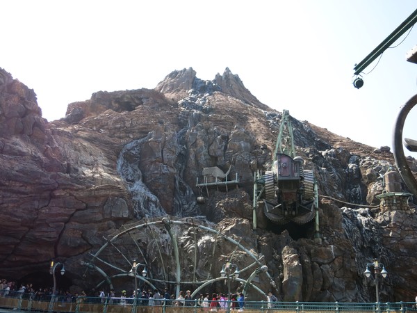 This is Mount Prometheus, intended to be the iconic welcoming structure of the park a'la Cinderella's Castle nextdoor at Disneyland. It's the exact same height as the castle, and smoke billows out of the peak at all times. It's also the ride building for the park's centerpiece attraction, Journey to the Center of the Earth.