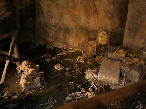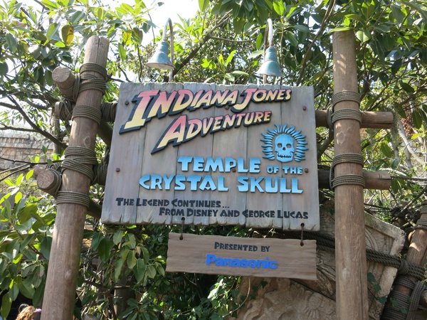 This is Lost River Delta, home to a small roller coaster with a 3-hour wait and Indiana Jones, which is a facsimilie of the original Indiana Jones Adventure: Temple of the Forbidden Eye at Disneyland, which was the most expensive attraction ever built at the original park until Cars Land came along. The wait when we showed up was 180 minutes, but here's a secret: tell the attendant checking folks in at the Fastpass line that you're a Single Rider (which means you're riding alone and they can use you to fill up ride vehicles where there are only 2-3 people in a row that seats 4). You skip the entire line and even skip the bit where Fastpass queue meets the regular queue. Hope and I were on this ride inside of 5 minutes (and we even got on the same jeep!)