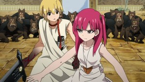 This is where season two, subtitled “The Kingdom of Magic,” picks up. In Sindria the gang encounters not only Sinbad's entourage, including a mage from the Magic-based kingdom of Magnostadt and another Falalis, both of whom will have major impacts on Aladdin and Morgiana, but also several emissaries of the Kou Empire. All of these people help to open Alibaba's and Aladdin's eyes to what is happening in the world outside of Balbadd and the few Steppes communities they have visited, and after helping Kou prince Hakuryū to capture a dungeon and learning more about the group Al Thamen, who are behind most of the political upheaval, is really trying to do. Aladdin, who is just beginning to understand his role in the world as one of the vaunted Magi, decides to go to Magnostadt to train, while Morgiana wants to search for her people. Alibaba, still unable to fully master his djinn, heads to Leam to train in the colosseum there before they all eventually team up again to defeat the evils that surround them.